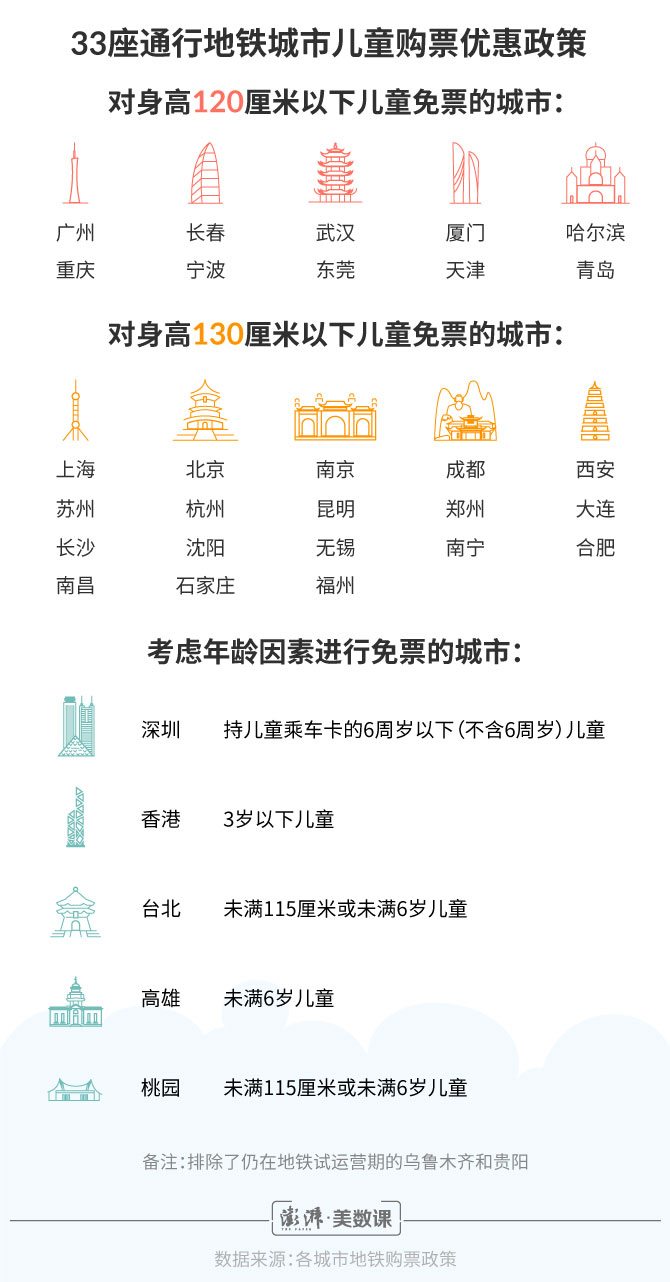 而在全国(含港澳台)已正式运营地铁的33座城市中(不含仍在试运营期的乌鲁木齐和贵阳),10座城市在地铁购票政策中规定,身高120厘米以下的儿童可在成人乘客或购票乘客的带领下,免费乘车。