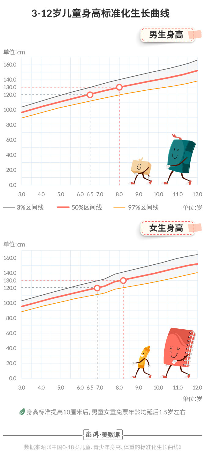 参考儿童身高的增长趋势将标准线提高至130厘米,相较120厘米而言,是一个更为合理的选择。参照首都儿科研究所生长发育研究室和北京大学儿童青少年卫生研究所共同发布的《中国0-18岁儿童、青少年身高、体重的标准化生长曲线》,截取其中3-12岁儿童的身高数据,可以发现:身高线被拉高10厘米后,享受免票优惠的儿童年龄范围大约被拓宽了1.5岁 。