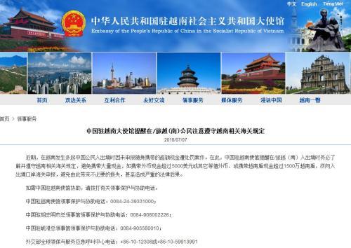 中国驻越南使馆提醒在/旅越出入境时,务必了解并遵守越南海关相关规定,避免携带大量现金。如携带外币现金超过5000美元或其它等值外币、或携带越南盾现金超过1500万,须向入出境口岸海关申报,避免因此带来不必要的损失,甚至造成严重的法律后果。
