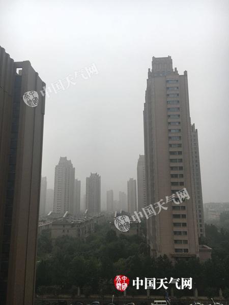 今晨6时左右,北京轻雾弥漫,远处建筑影影绰绰。