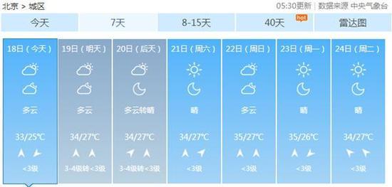 展望未来一周,北京天气以晴到多云为主,白天最高气温在34-35℃左右,夜间最低气温25-27℃,天气闷热,请做好防暑降温措施。