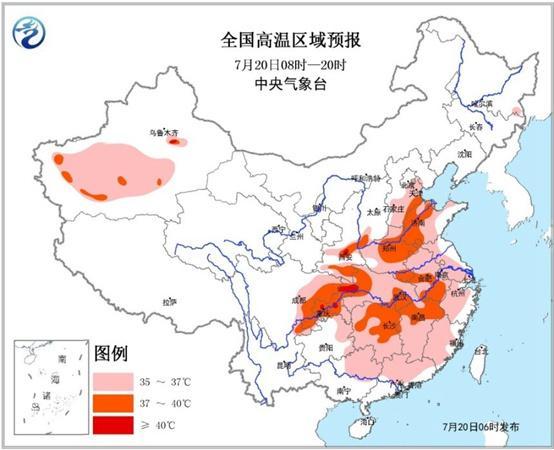 预计7月20日白天,陕西南部、华北南部和东部、黄淮、江淮、江汉、江南、华南北部、四川东部、贵州东部、重庆、新疆南疆盆地等地最高气温35~36℃,其中,陕西南部、山东西部、河南北部、安徽南部、湖北东南部、湖南东北部、江西北部、四川东部、重庆、新疆南疆盆地等地的部分地区最高气温37~39℃,局地可达40℃。
