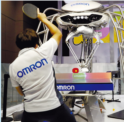 工作人员在欧姆龙展台与机器人打乒乓球。