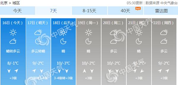 昨夜北风渐停,未来几天主要以晴到多云天气为主,阳光相伴。北京市气象台预计,今天白天晴间多云,北转南风二三级,最高气温8℃;夜间晴转多云,南转北风一二级,最低气温-1℃。冷空气影响尤在,今天气温下降,请注意添衣保暖。