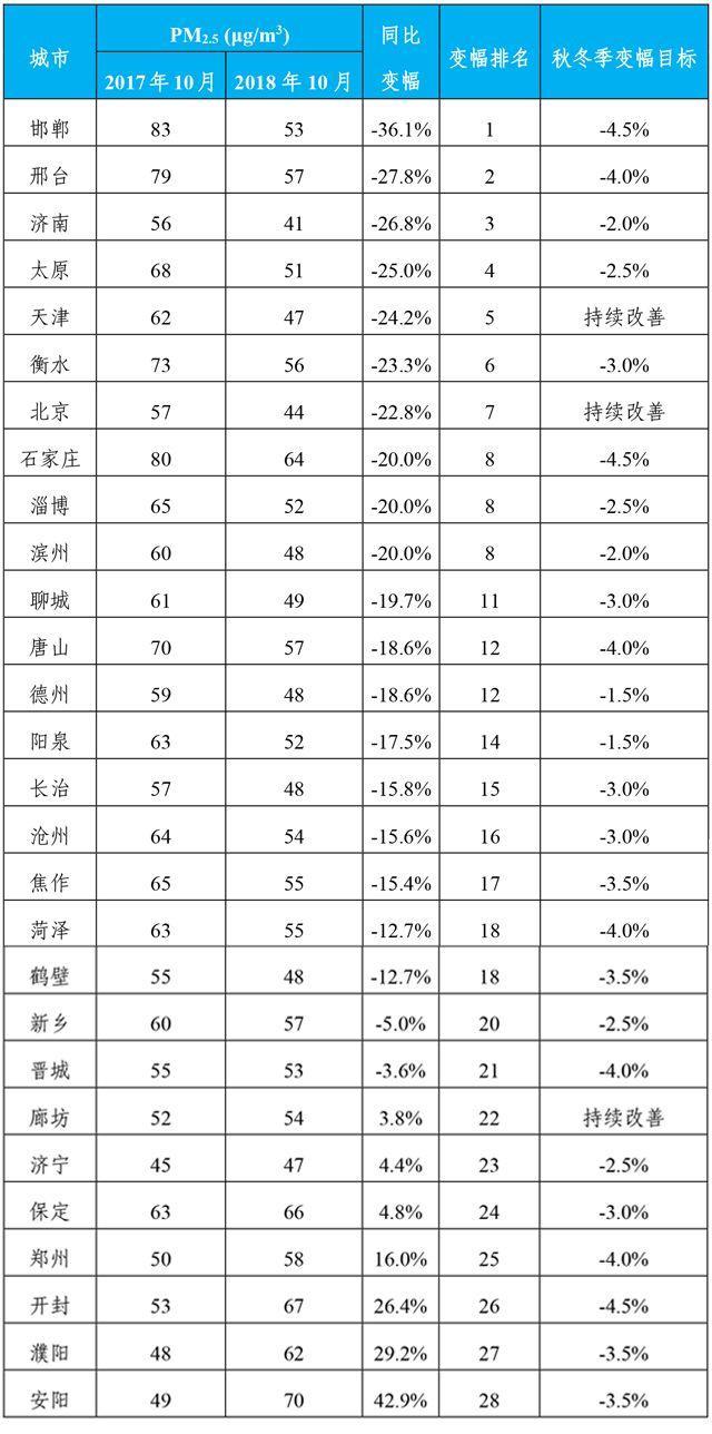 京津冀及周边地区“2+26”城市2018年10月PM2.5浓度范围为41~70微克/立方米(μg/m3),平均为54 μg/m3,同比下降11.5%。浓度最低的4个城市是济南、北京、天津和济宁(并列第3),分别为41 μg/m3、44 μg/m3、47μg/m3、47 μg/m3;浓度最高的3个城市是安阳、开封和保定,分别为70 μg/m3、67μg/m3和66 μg/m3。从改善幅度看,21个城市PM2.5平均浓度同比下降,其中20个城市PM2.5平均浓度降幅满足秋冬季改善目标进度要求;降幅排名前3位的邯郸、邢台和济南,同比分别下降36.1%、27.8%和26.8%。安阳、濮阳、开封、郑州、保定、济宁、廊坊等7个城市PM2.5浓度同比不降反升,其中安阳上升幅度最大,同比上升42.9%。