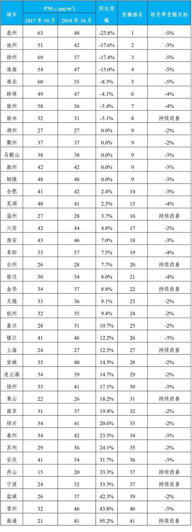 长三角地区2018年10月PM2.5平均浓度及同比变幅排名
