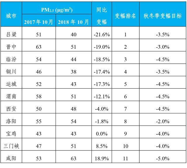 汾渭平原2018年10月PM2.5平均浓度及同比变幅排名