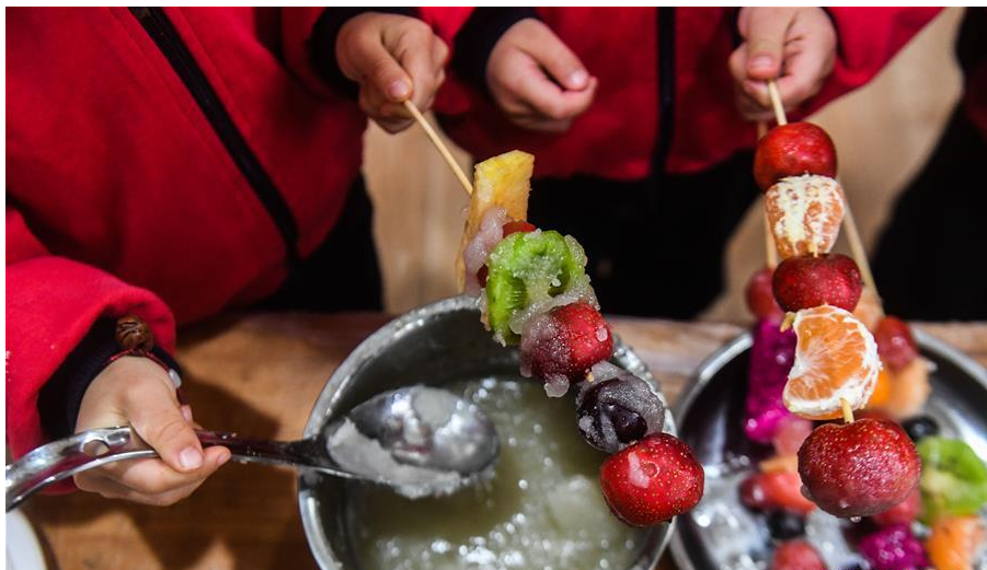 11月21日,孩子们在老师的带领下用桔子、山楂等水果制作糖葫芦。
