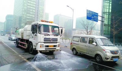 昨天,西城环卫洒水车在辖区路段进行洒水降尘作业。由于空气重污染来袭,西城环卫增加了洒水作业的频次和时间,降尘比日常增加1次。本报记者 方非摄