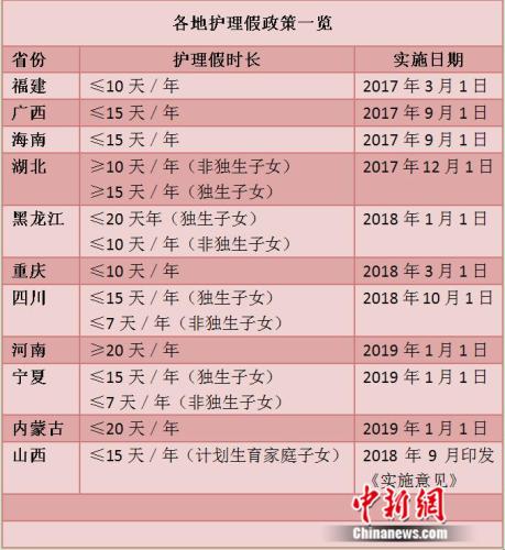据中新网记者不完全统计,目前至少有福建、广西、湖北、海南、黑龙江、重庆、四川、河南、宁夏、内蒙古、山西等10余省份出台了具体规定。各地的护理假时长有所区别,此外,在湖北、黑龙江、四川、宁夏等地还规定,非独生子女也可享受这一待遇。