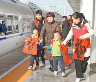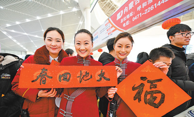 在呼和浩特铁路东站,乘务员为旅客送春联及“福”字,让旅客带着祝福回家。 张 枨 陈立庚摄影报道 |