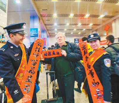 大同铁路公安处大同车站派出所民警将亲手书写的春联送到外国游客手中。 李 曼摄(人民视觉) |