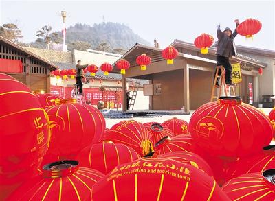 春节前,西柏坡红旅小镇工作人员将一个个大红灯笼高高挂起,张灯结彩庆新春。 记者 赵海江摄