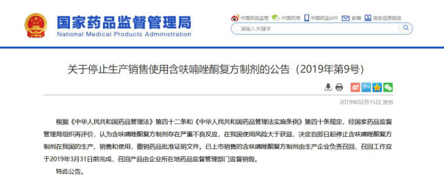 国家药品监督管理局在近期发布的公告中指出,停止含呋喃唑酮复方制剂在我国的生产、销售和使用,撤销药品批准证明文件。已上市销售的含呋喃唑酮复方制剂由生产企业负责召回,并于2019年3月31日前完成,召回产品由企业所在地药品监督管理部门监督销毁。