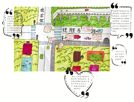这个细心姑娘把平时观察到的细节全画在了地图中。比如哪些地方有野狗,哪里的垃圾落叶比较多,哪个路口要注意交通安全。