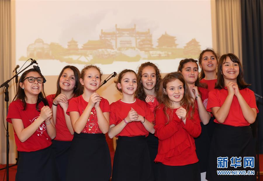 这是2019年2月8日,在意大利拉齐奥的古镇蒂沃利,蒂沃利国立住读学校的学生们在中国春节庆祝活动上给大家拜年。 新华社记者 程婷婷 摄