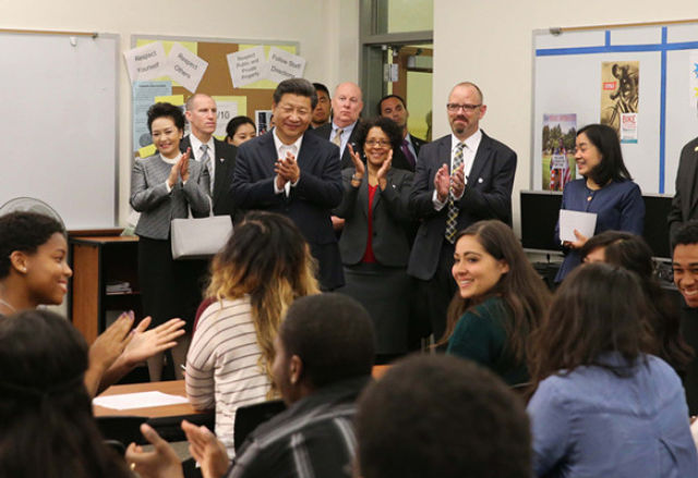 2015年9月23日,国家主席习近平参观美国塔科马市林肯中学。这是习近平夫妇走进教室,同师生们交流。新华社记者刘卫兵摄