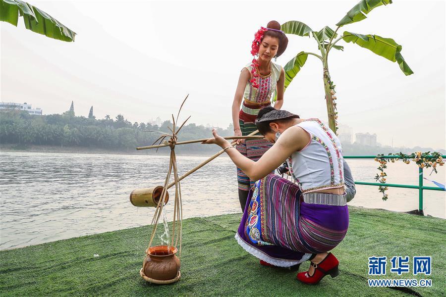 4月15日,傣族少女在澜沧江畔举行的泼水节取水仪式上取水。 当日,云南省西双版纳傣族自治州举行傣历新年取水仪式及泼水狂欢,各族群众和游客在景洪市泼水广场互相泼水,互祝吉祥、幸福。
