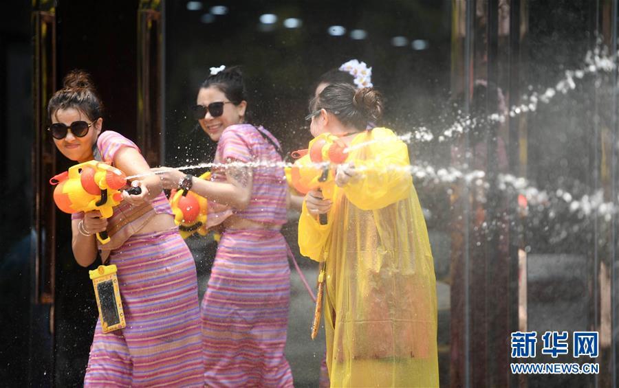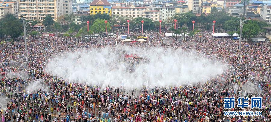 4月15日,人们在景洪市泼水广场参加泼水节狂欢。 当日,云南省西双版纳傣族自治州举行傣历新年取水仪式及泼水狂欢,各族群众和游客在景洪市泼水广场互相泼水,互祝吉祥、幸福。