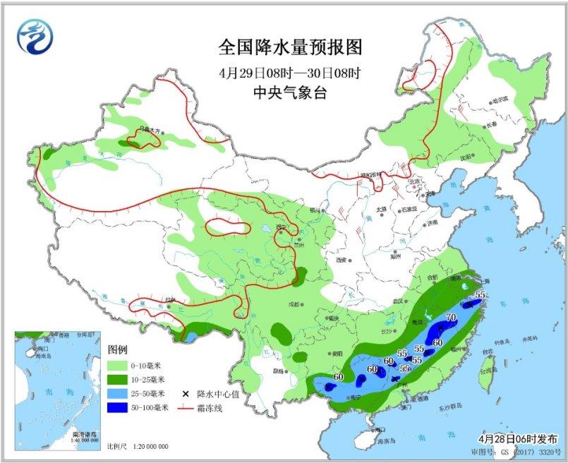 图1 全国降水量预报图(4月28日08时-29日08时)