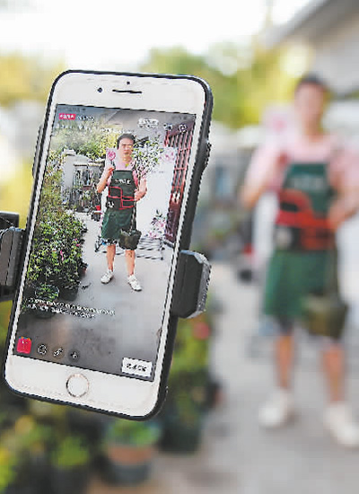 江苏省宿迁市沭阳县,一名花农正在家门口直播销售月季花。 新华社记者 李 响摄