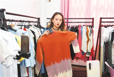 据不完全统计,目前浙江义乌有“网红直播”从业者6000多人,涉及市场经营户3000余家。图为在义乌市北下朱村的一家服装店内,网红主播正在直播。 |