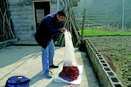 杨运大到贫困户家里走访,帮助晒辣椒。