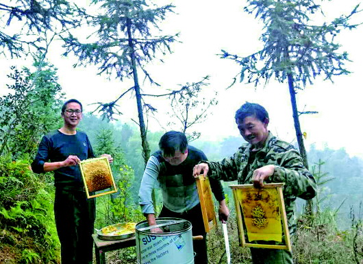 ▲邓文慧(左一)帮贫困户收蜂蜜。