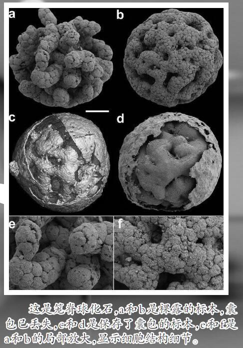 这是笼脊球化石,a和b是裸露的标本,囊包已丢失,c和d是保存了囊包的标本,e和f是a和b的局部放大,显示细胞结构细节。