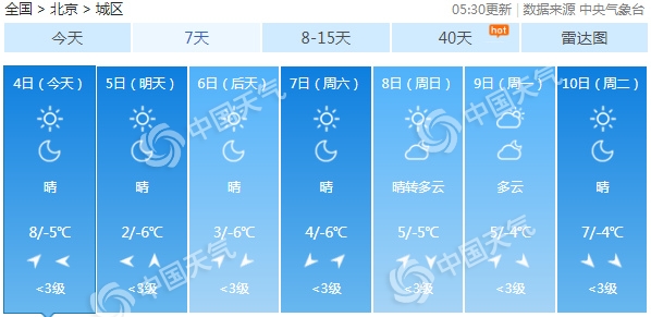 今天,北京延续晴好天气,较适宜户外活动。北京市气象台4日6时发布天气预报,预计,今天白天晴,北转南风二、三级,最高气温8℃;夜间晴,南转东风二、三级,最低气温零下5℃。
