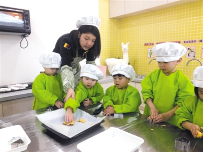12月3日,芳庄二幼珠江骏景园小班学生在老师的帮助下制作饼干。记者 方怡君 摄