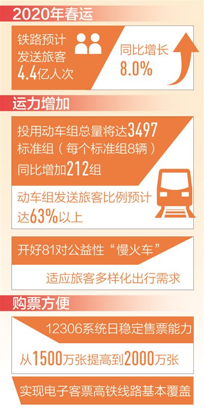 国铁集团相关负责人介绍,2020年铁路春运自1月10日开始,2月18日结束,共40天,节前15天,节后25天。铁路部门安排节前每日开行旅客列车5275对,运输能力达到1010万人;节后每日开行旅客列车5410对,运输能力达到1043万人。