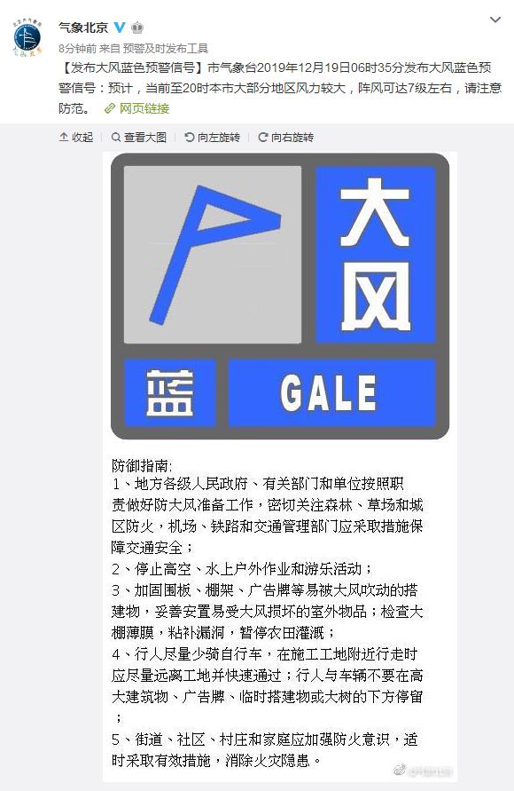 北京市气象局官方微博消息,北京市气象台2019年12月19日6时35分发布大风蓝色预警信号:预计,当前至20时本市大部分地区风力较大,阵风可达7级左右,请注意防范。
