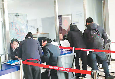 “大家先不要急。留一两个人在窗口讲,让我先了解情况。那边有椅子,其他各位歇歇坐坐,喝口水。”窗口内,身穿蓝色制服的工作人员向前欠起身,语气平和镇定地说道,紧绷的气氛稍微缓和了些。