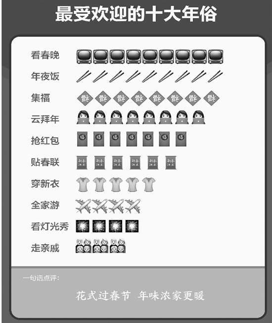 此次一同入选十大最受欢迎年俗的还有:看春晚、年夜饭、贴春联、走亲戚、穿新衣、看灯光秀。还有网友戏称,“相亲”也正成为单身青年“春节新年俗”。