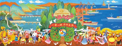 聚焦时代主题,新年画创作与时代同频共振。例如年画《一带一路》是为庆祝2017年5月在北京举行的“一带一路”国际合作高峰论坛而作。作品以喜庆、欢腾为基调,融汇民间美术元素来表达对此次盛会的祝贺。画面中央那棵“生命树”,就是民间美术中常用来象征旺盛生命力的吉祥图式符号。把此次会议会徽置于树中,上方裹有红色绸带,写着“一带一路,合作共赢”,寓意蓬勃向上的旺盛生命力。其间飞翔的白鸽,象征和平发展的环境。画面左边有客货列车及风电绿色能源,与近处山峦中的长城相映衬,寓意古老中华文明正焕发新的生命力;右边有繁华的海港码头、蓝色海洋上来往船只……作品艺术地表达了“一带一路”的恢弘主题,拓宽了年画创作的题材,也是年画“笔墨当随时代”的真实写照。