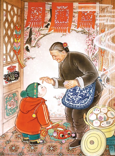 凝练生动的时代故事,让新年画引发广泛的情感共鸣。“摇啊摇,摇到外婆桥……”这首江南耳熟能详的童谣勾起多少海外游子的思乡情。廖开明的《摇到外婆桥》以这首童谣点题,生动描绘了海外游子归来寻根的情景,表现了对国家、民族、文化认同的家国情怀,反映出文旅融合的新气象。张苠的《奶奶点福点》以独特的视角,表现了春节农家的喜庆气氛。北方农家春节蒸面花时,要用食色(红)在热气腾腾的面花上点上红点,亦称福点,以示吉利。画面上小孙子手持鱼灯跑来,奶奶为爱孙额头点上个福点,祝他吉祥平安,幸福生长。背景门楣的吊笺,门上的肥猪拱门剪纸,门外喜鹊登梅,飘着瑞雪,营造出一派喜庆、祥和、温馨的春节情景。