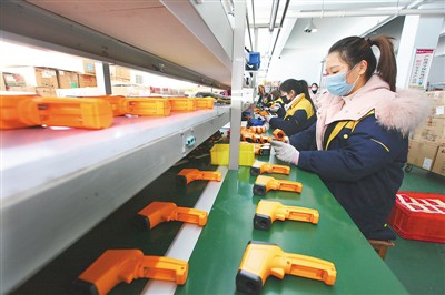 作为一家生产仪器仪表和红外测温设备的企业,安徽马鞍山川宇电子有限公司提前结束休假,复工复产。目前,该公司红外测温枪生产线已开足马力,日产量达1000台左右。图为1月31日,川宇电子的红外测温设备生产线上,工人们正在紧张作业。 |