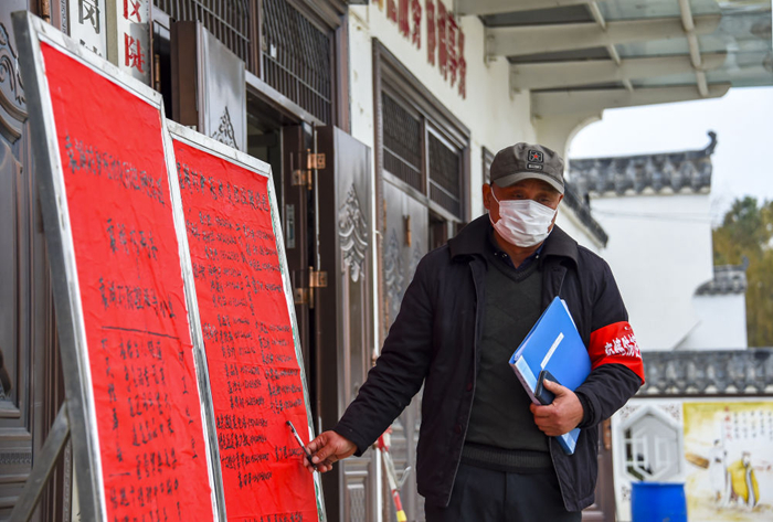 第二天,村干部就忙碌起来。每家每户走访登记,摸排武汉返乡人员并检测体温,开展防疫知识宣传,将偷偷进村的外来人员劝离……