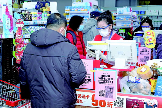 春节以来,超市客流量增加,物美超市北京石景山区太阳岛门店收银员叶宗萍一直在门店坚守,从春节至今没歇一天。采访对象供图