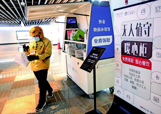 3月5日,在上海兴业太古汇商场,一名外卖员在无人值守暖心柜领取爱心餐点。