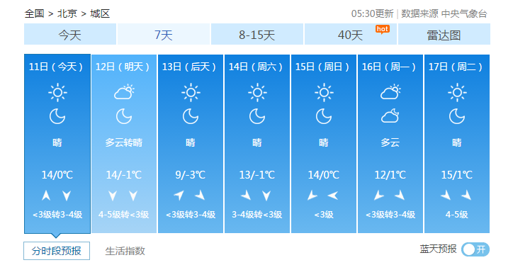根据北京市气象台今早6时发布的最新预报,今天白天晴,北转南风2、3级,最高气温14℃;夜间晴间多云,南风1、2级转北风3、4级(阵风6级),最低气温1℃。