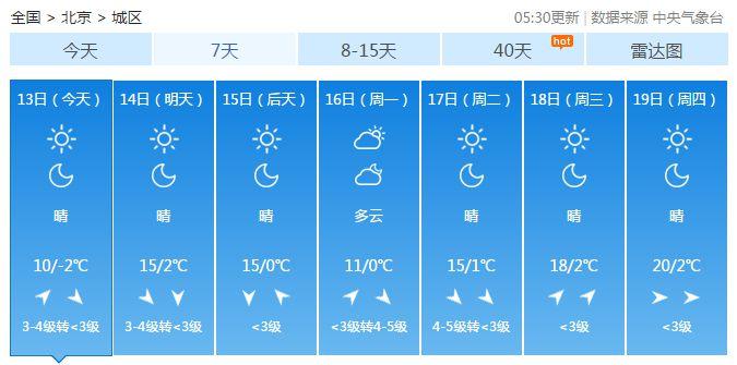昨天,北京大风劲吹,能见度佳,蓝天“颜值”在线。监测显示,昨天南郊观象台最低气温为3℃,出现在凌晨3时55分,到7时左右已上升到7℃,白天最高气温在14℃左右。