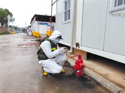 每日的巡查也必不可少。火神山消防站的队员们每天两次在院内巡查,保证安全出口、疏散通道随时保持畅通,还要给分布在院区的9个消火栓测压,保证水压符合安全要求。