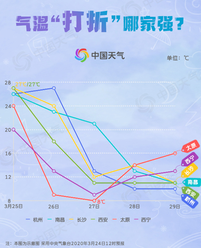 27日,南方大部也将加入降温的行列,单日降温幅度没有北方剧烈,在6-8℃左右,但是累积降温幅度大,27日开始的两三天内,部分地区也将超过10℃。城市中,杭州最高气温累计降幅可达17℃、南昌降16℃、长沙降15℃、贵阳降14℃、上海降13℃,最高气温纷纷降至10℃出头。29日,江淮、江汉和江南大部最低气温也仅有4~9℃。