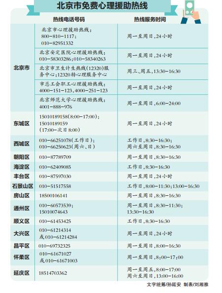 为在疫情防控过程中最大程度减少各类人群的心理伤害,丰台区线上多平台齐发力,开展心理疏导工作。1月25日,丰台区心理援助热线正式开通,2月14日,服务时间由原来的7:00-22:00更改为24小时服务。截至3月26日,心理援助热线累计服务1103小时,服务287人次。