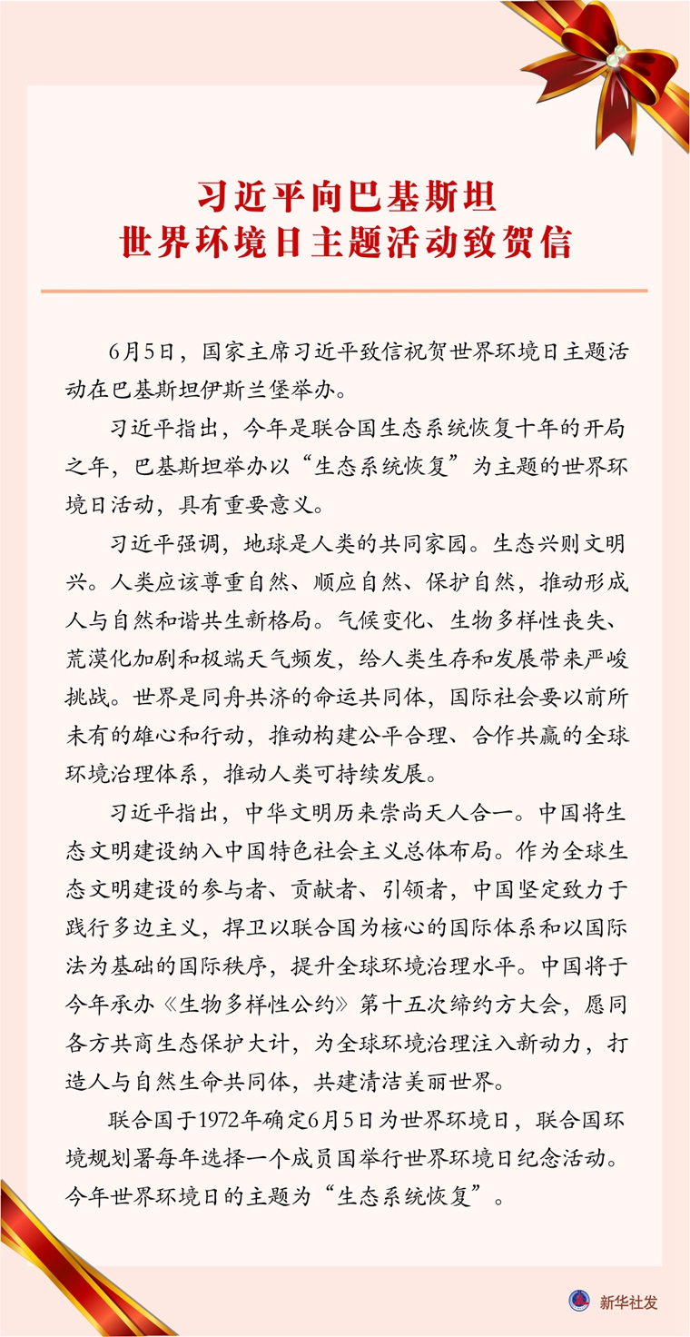 6月5日,国家主席习近平致信祝贺世界环境日主题活动在巴基斯坦伊斯兰堡举办。