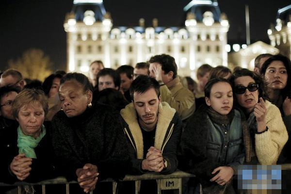 11月15日,民众聚集在法国巴黎圣母院外悼念恐怖袭击事件罹难者。当晚,巴黎民众和恐袭遇难者家属及幸存者一起在巴黎圣母院参加追思弥撒,悼念巴黎恐怖袭击事件罹难者。截至目前,周五晚间发生在巴黎市中心及其北郊法兰西体育场的系列枪击爆炸事件已造成129人死亡,352人受伤,其中99人伤势严重。