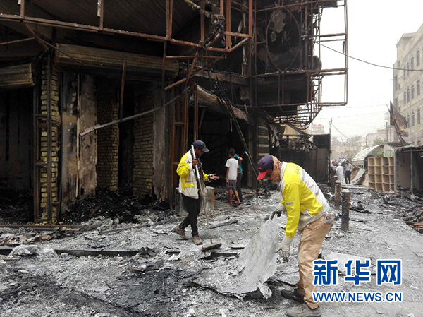 7月3日,在伊拉克首都巴格达卡拉达区,工作人员清理爆炸现场。新华社发(哈利勒·达乌德摄)