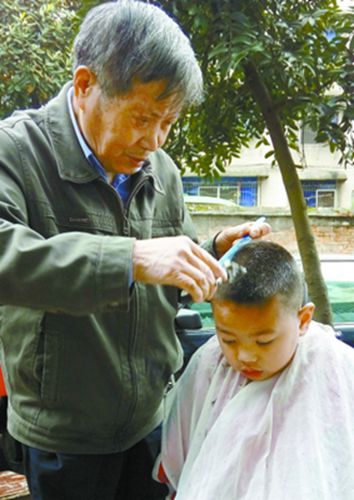 推、梳、刷、刮……很快,一个漂亮的小平头剪好了。当地居民刘书军剪完头发,摸摸头,满意地向梁老致谢,并给老人递上1块钱。今年76岁的梁志高,这已经是他义务为群众理发的第52个春秋。
